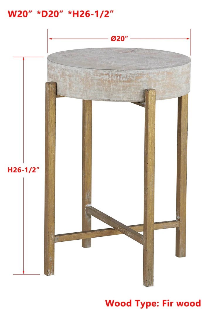 Combine the Collin Wood Accent End Table with your style and watch it transform your space. The wooden block tabletop features a white-washed finish, complemented by sleek metallic gold legs that add a classy touch to the design. Standing 26.5" high with a 20" diameter, this end table is perfect for end tables, living rooms, or entryways.
