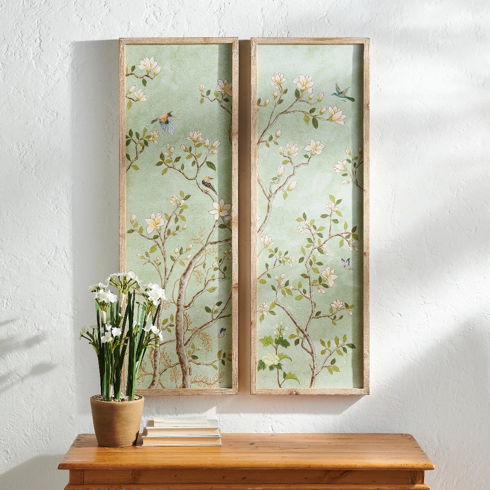 Bring a sense of calm and classic beauty to your space with this framed floral and bird wall art panel. Featuring delicate flowering branches, soft green tones, and charming birds and butterflies, this artwork adds a timeless, nature-inspired touch to any room.