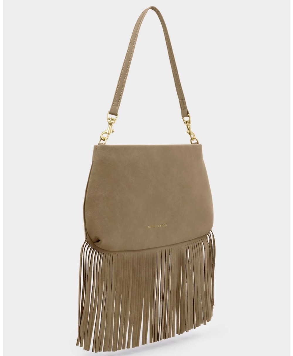 Embrace the season’s boho revival with the Cali Small Fringe Shoulder Bag in Taupe. Perfect for summer styling, whether you’re headed to a festival or sun-soaked destinations, it features a soft suedette design with fringing and a detachable strap that easily transforms it into a sleek clutch or wristlet.