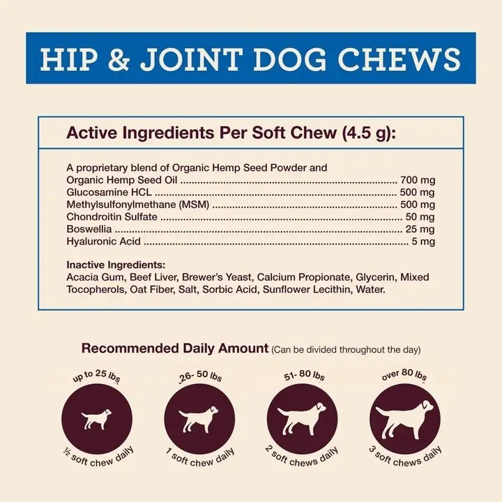 Get your dog moving again! Supports healthy hips and joints. Larger, Fresher Chews, more active ingredients than the others.