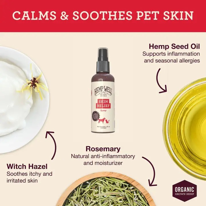 Hemp Well Skin Relief Spray for Dogs and Cats is a topical spray that helps to relieve irritated skin. It contains a blend of hemp seed oil, witch hazel, and rosemary oil, which work together to soothe the skin, replenish moisture, and support inflammation.