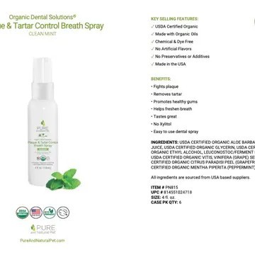 Freshen breath naturally while reducing plaque and tartar with our USDA Certified Organic clean mint breath spray. Made with Organic oils and does not contain chemicals, dyes, artificial flavors, preservatives or additives. Made in the USA.