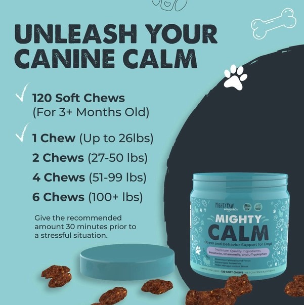 Help your dog relax with Mighty Paw Waggables Calm Chews. Formulated with melatonin, chamomile, and L-theanine, these soft chews are designed to promote calm behavior, reduce stress, and ease separation anxiety. Perfect for travel, thunderstorms, fireworks, or daily stressors, the bacon-flavored chews are made in the USA with high-quality, safe ingredients. The tasty bite-sized chews are easy to administer and ideal for dogs of all sizes.