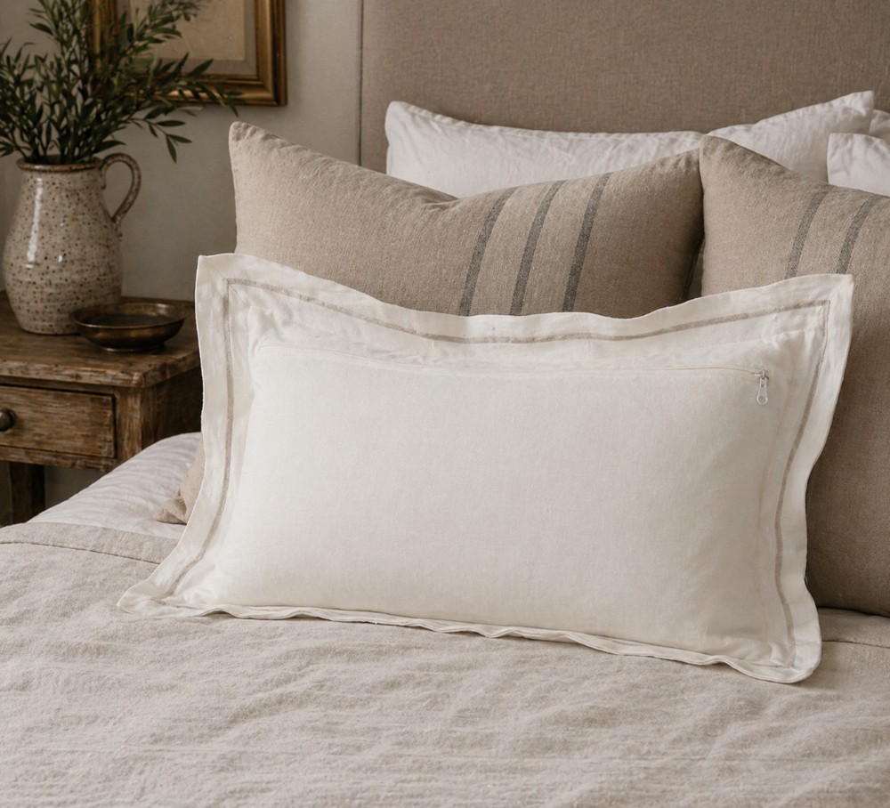 Add effortless sophistication to your home with this neutral linen lumbar pillow. Featuring a soft off-white linen body accented by a contrasting natural center panel, this pillow brings subtle texture and timeless appeal to any space. The tailored edge detailing adds a relaxed yet polished finish, making it ideal for layering on sofas, beds, or accent chairs.