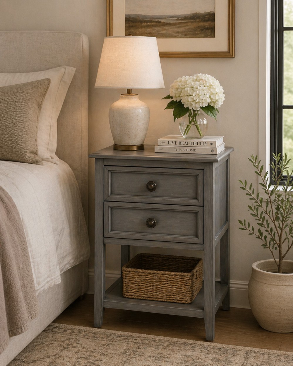 Our Vintage Gray Two Drawer Side Table is the perfect accent for any cozy bedroom or living space. With its soft gray finish and classic design, it blends seamlessly into both modern and farmhouse-inspired homes.