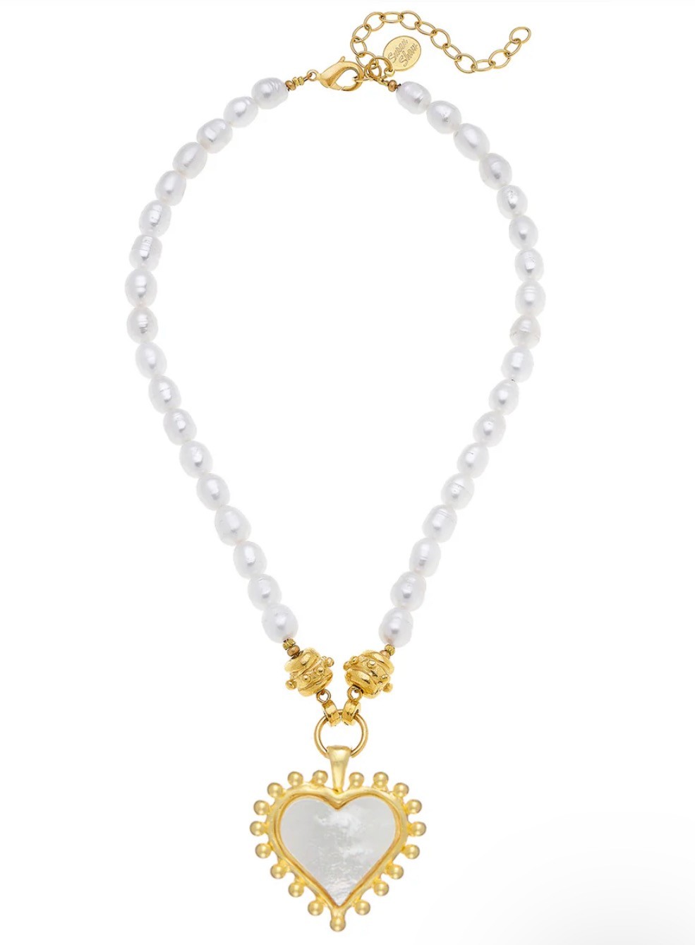 This necklace features beautiful Mother of Pearl hand-cut to a favorite Susan Shaw shape on a genuine freshwater pearl strand. Its reimagined heart burst design adds cheerful charm to any ensemble. Measures 16" with 3 inch extender. Triple plated 24k gold plated.