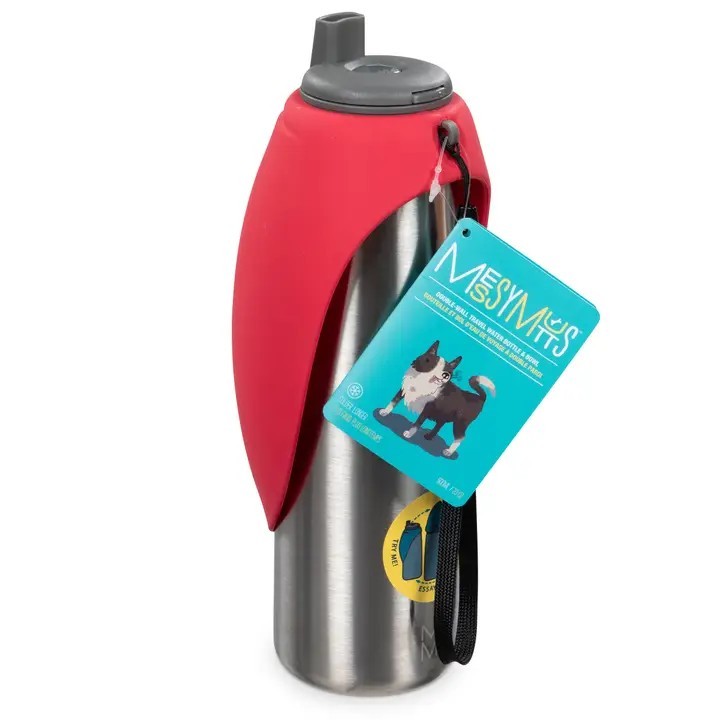 Perfect for your thirsty mutt on the go! Award-winning travel water bottle and bowl is easy to use and ideal for walks, hikes and road trips. Just flip up the extra wide silicone drinking bowl and you are ready to serve! Unused water drains back into the stainless-steel bottle after use and the bowl folds back over the bottle for easy portability. Easy-pour water release on/off button. The water will self-level in the bowl. Made from durable, hygienic stainless steel with a food-grade safe silicone flip up bowl. BPA and PVC free. This 24 oz / 700mL stainless bottle and silicone bowl are dishwasher safe. Hand wash removable cap or dishwasher safe top-shelf only.